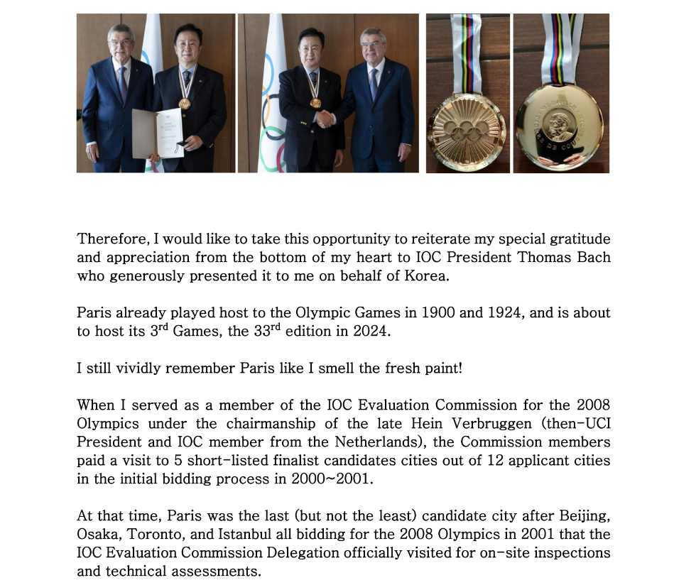필자는 “Reminiscences of Paris and Tribute to the Former French President Jacques Chirac who loved most the Olympic Games in Paris”란 제목의 Paris와 관련된 추억과 에피소드를 진솔하게 기술하였는데 2008년 올림픽유치심사를 위한 IOC평가위원회 위원의 한 사람으로 특히 Paris에서 현장실사 및 회의에서 경험했던 여러 가지 정담과 당시 Jacques Chirac프랑스 대통령 궁(Palais d”Elysee)예방 시 대통령이 칭찬하였던 제 불어 어휘에 대한 일화도 소개하였습니다.