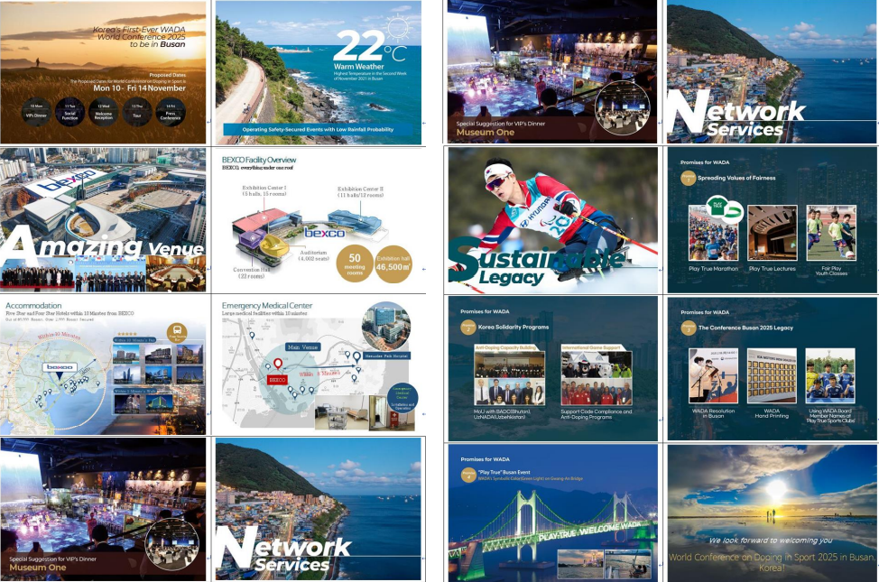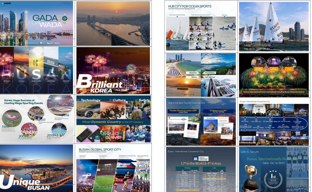 1) 필자(부산시 명예시민 제78호)가 2022년 3월~5월 한국도핑방지위원회(KADA)가 주도하여 부산광역시가 26년 만에 아시아 최초로 세계도핑방지기구(WADA) 2025년 세계총회 유치성공과정에 직접 참가하여 PT내용 핵심을 유치준비팀과 함께 구성 설계하고 리허설도 자문하였던 경험을 공유하고 제안하고자 합니다.