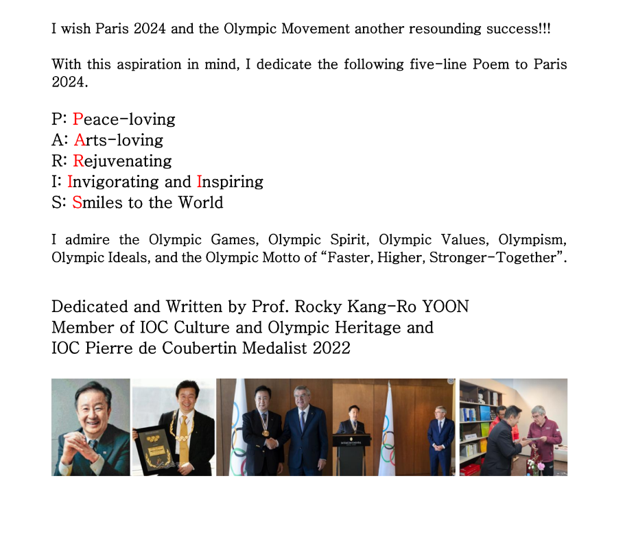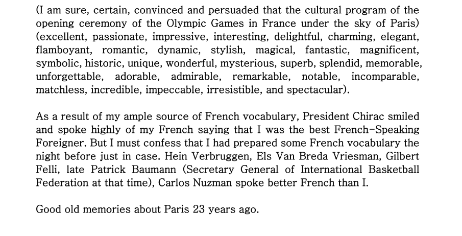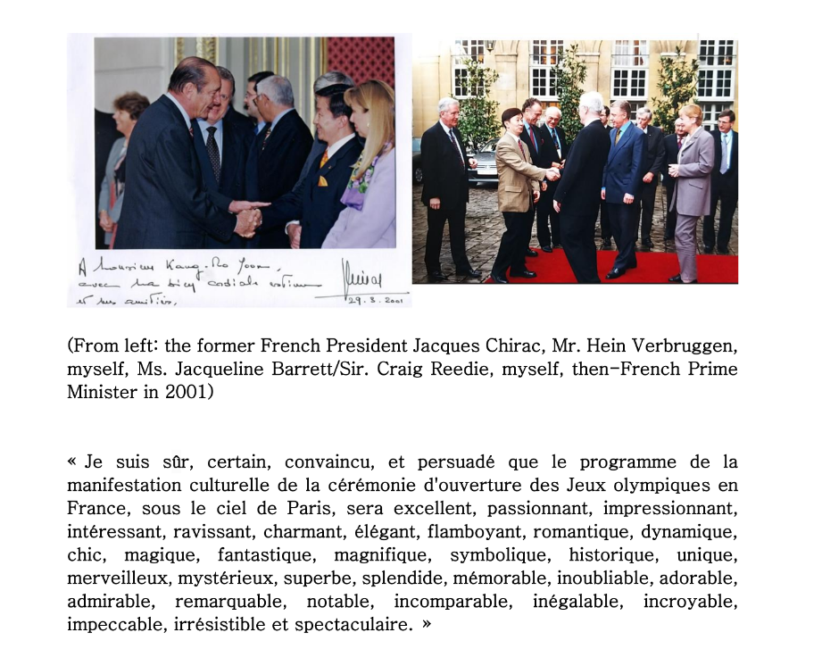 필자는 “Reminiscences of Paris and Tribute to the Former French President Jacques Chirac who loved most the Olympic Games in Paris”란 제목의 Paris와 관련된 추억과 에피소드를 진솔하게 기술하였는데 2008년 올림픽유치심사를 위한 IOC평가위원회 위원의 한 사람으로 특히 Paris에서 현장실사 및 회의에서 경험했던 여러 가지 정담과 당시 Jacques Chirac프랑스 대통령 궁(Palais d”Elysee)예방 시 대통령이 칭찬하였던 제 불어 어휘에 대한 일화도 소개하였습니다.